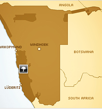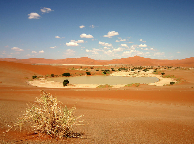 Die weißen Vleis (Lehmpfannen) bilden einen scharfen Kontrast zu dem roten Sand und dem endlos blauen Himmel. Tiere und Pflanzen, die auf die nächtlichen Wüstennebel angewiesen sind, finden im Sand und unter den verwitterten Kameldornbäumen Zuflucht vor der schwellenden Mittagshitze.